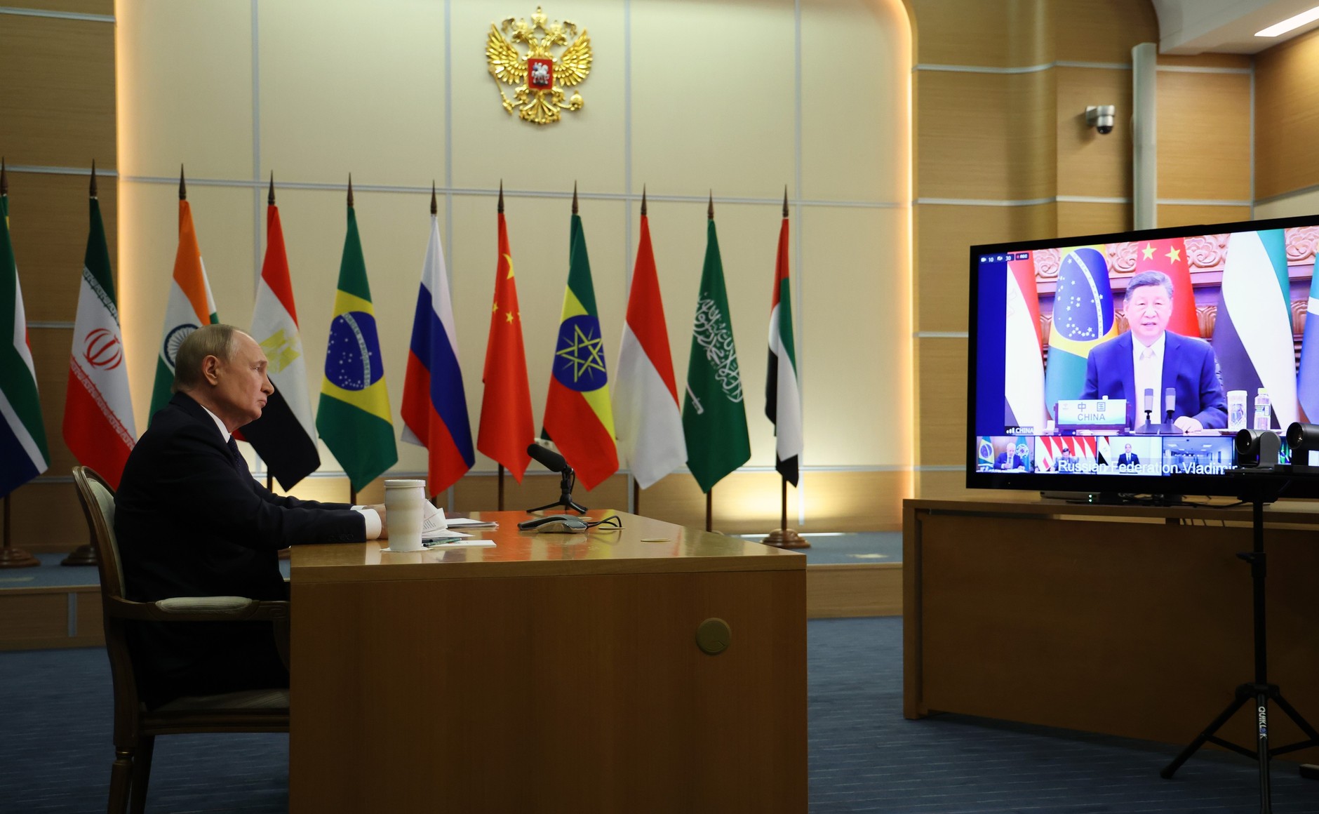 Владимир Путин принял участие во внеочередной встрече БРИКС, организованной по инициативе бразильского председательства в формате видеоконференции.