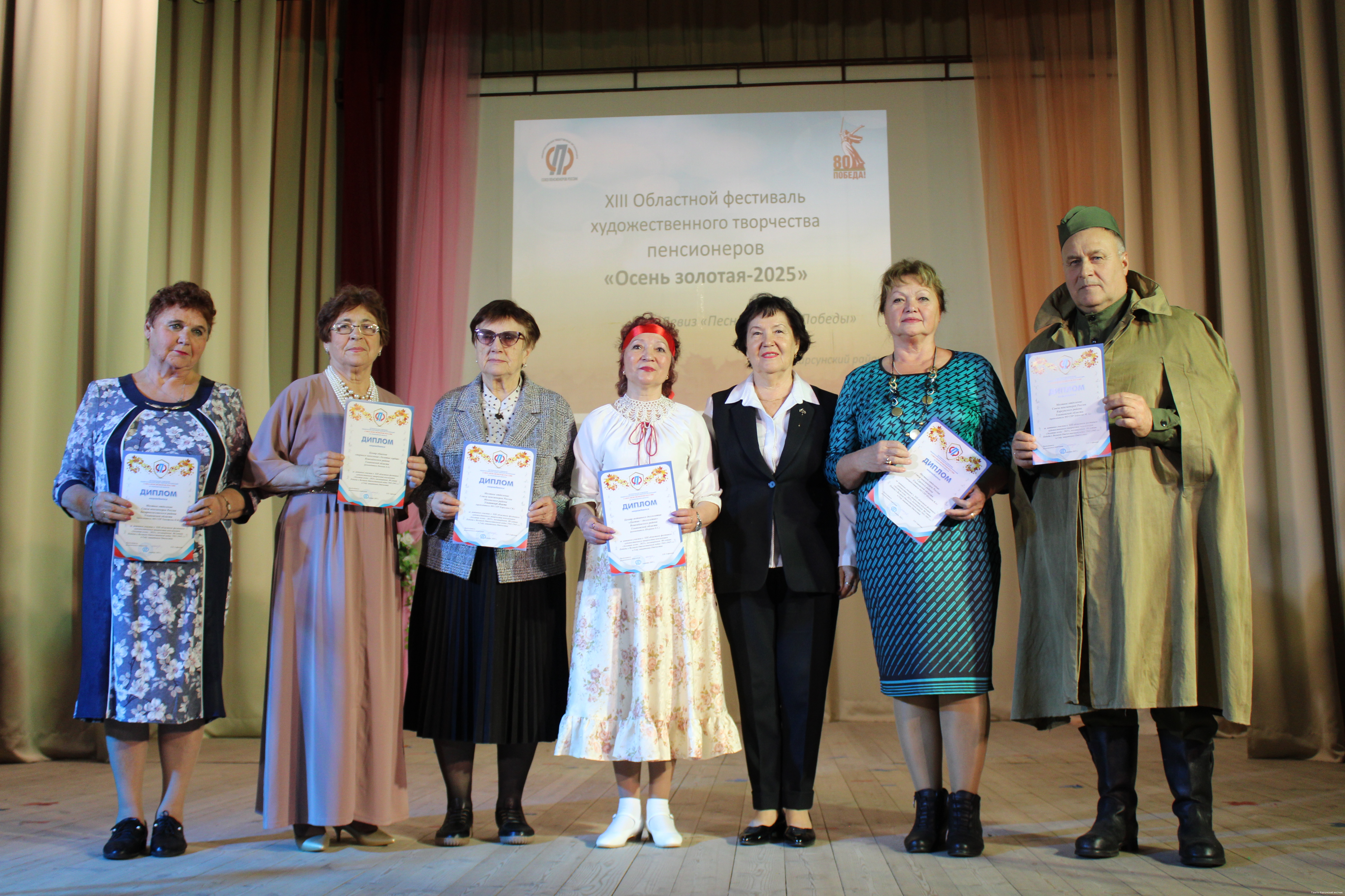 Представителей «серебряного» поколения приветствовала председатель правления регионального отделения Союза пенсионеров России (РО СПР) в г. Ульяновске Любовь Сафонова: «Проведение этого фестиваля стало возможным благодаря тому, что наше региональное отделение выиграло областной грант «Быть здоровым и активным – это очень позитивно». В этом году фестиваль проводится под девизом «Песни великой Победы» и посвящён Году защитника Отечества и 80-летию Победы в Великой Отечественной войне». Она отметила, что среди членов СПР много волонтёров, которые занимаются оказанием гуманитарной помощи участникам СВО, и вручила Благодарственное письмо областного ресурсного центра развития добровольчества и благотворительности Т.А. Огневой, члену волонтёрской группы Центра активного долголетия «Факел» р.п. Карсуна. В фойе РДК была развёрнута вставка изделий народного творчества и образцы сухого пайка, витаминных чаёв и супов быстрого приготовления, которые производят и направляют в зону СВО карсунские активисты.