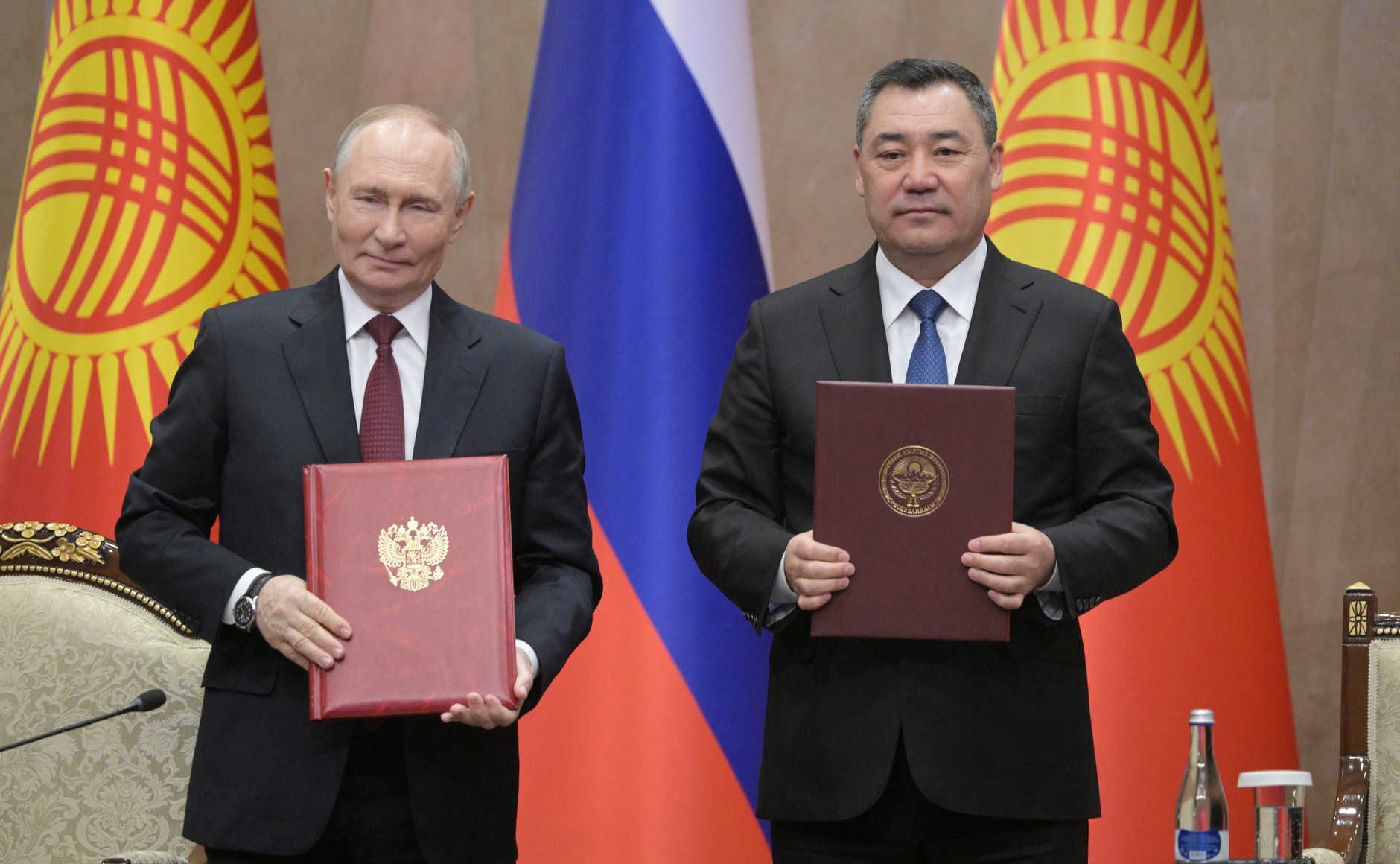 По их окончании лидеры подписали Совместное заявление об углублении отношений союзничества и стратегического партнёрства. В присутствии Президентов состоялся обмен другими документами, подписанными в ходе госвизита Владимира Путина в Киргизию. Главы государств сделали заявления для представителей СМИ.