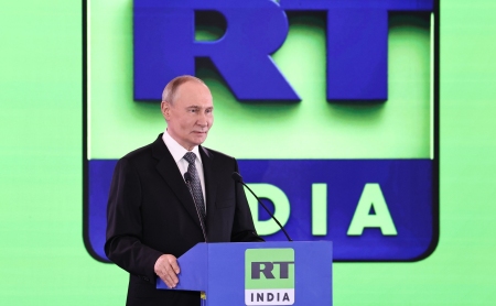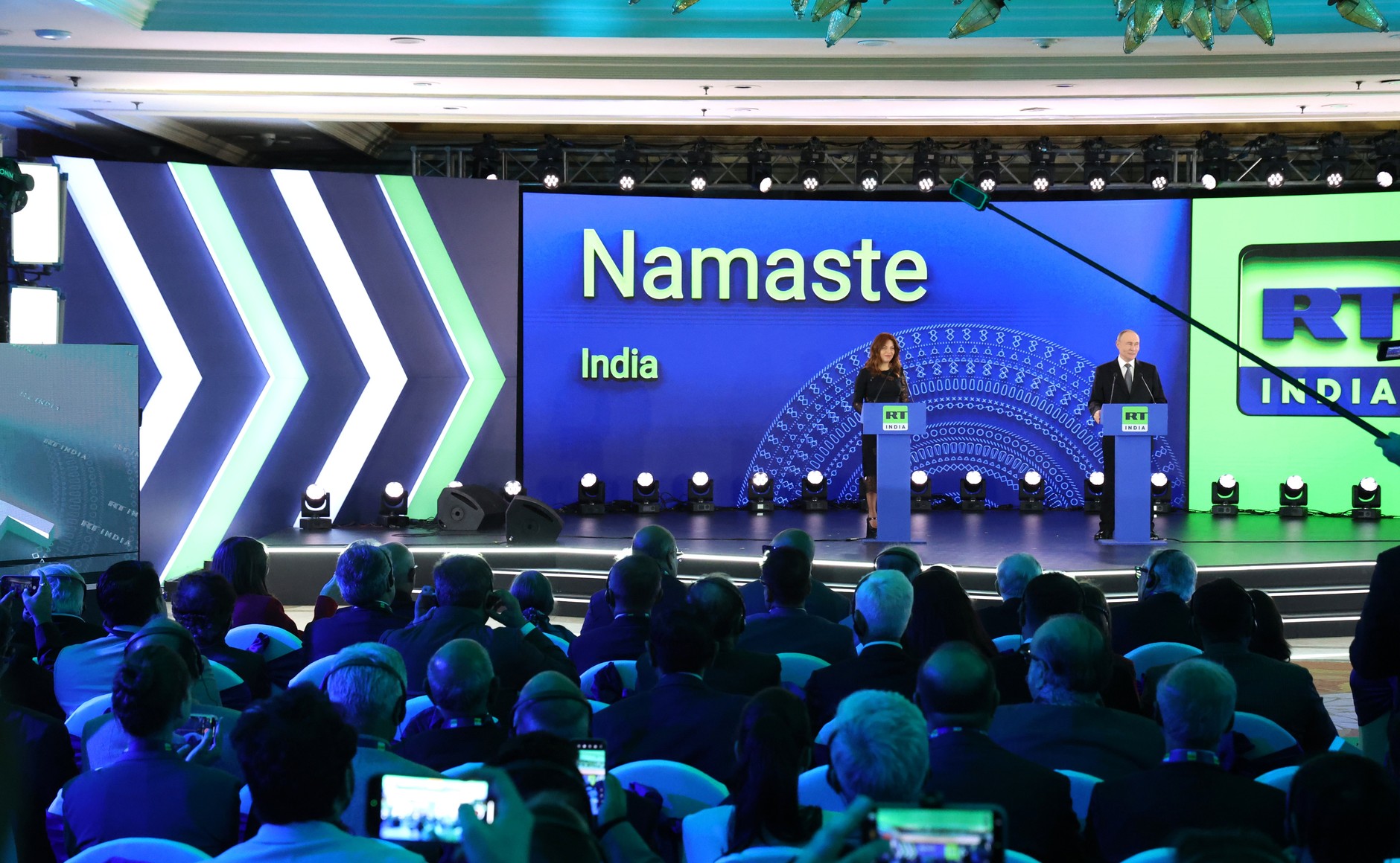 В Нью-Дели Владимир Путин вместе с главным редактором телеканала Russia Today Маргаритой Симоньян принял участие в церемонии запуска вещания телеканала RT India.