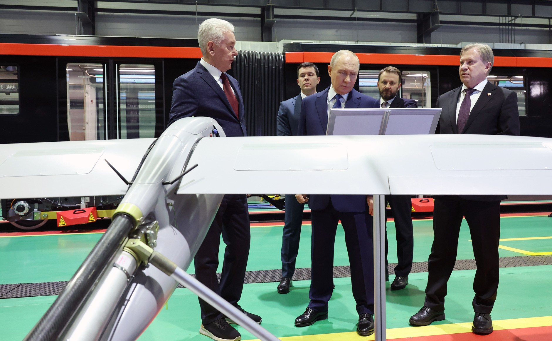 Перед началом совещания Владимир Путин осмотрел выставку о беспилотных технологиях, развёрнутую на площадке метродепо.