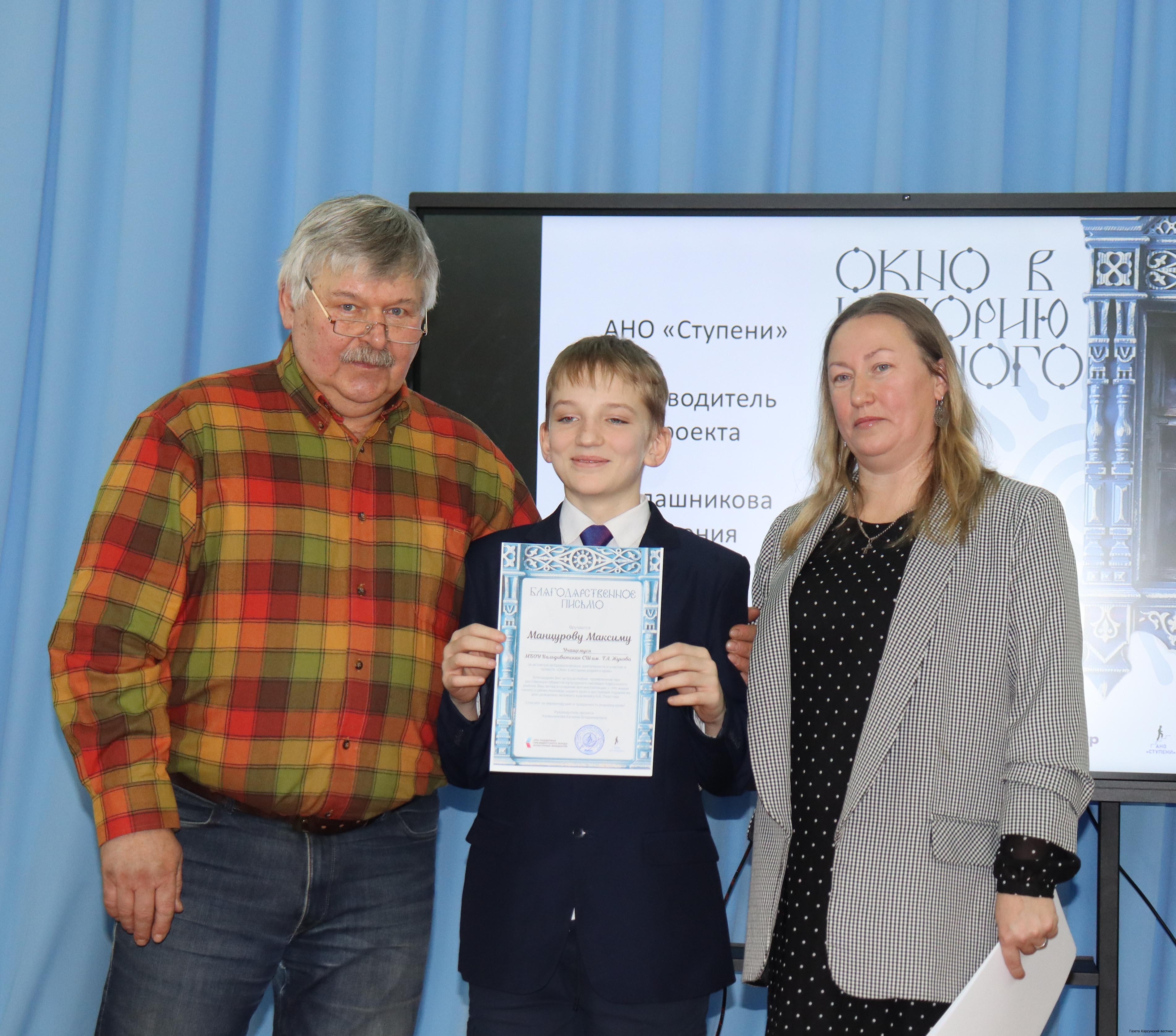 Директор Карсунской ДШИ Игорь Львов вручил благодарственные письма спонсорам, оказавшим финансовую поддержку хореографическому ансамблю «Вдохновение» в организации поездки в Москву на 54-й Международный фестиваль-конкурс «Звёзды столицы». Также были награждены дипломами победители ежегодной школьной олимпиады «Аркадий Пластов и Православие».