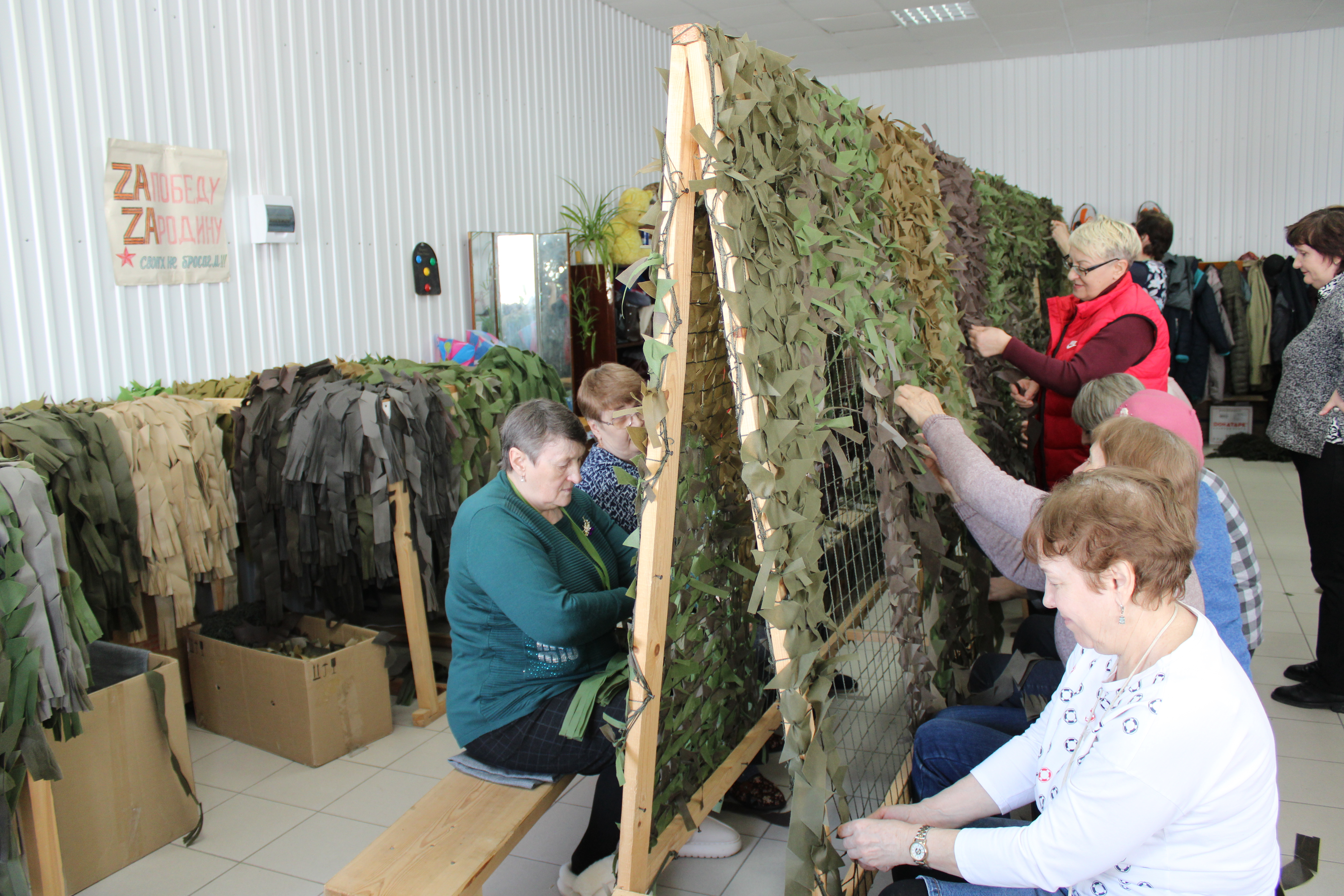 Женщины каждый день по шесть часов проводят в Центре. Одни нарезают спанбонд для сетей, другие – шьют бельё для госпиталей и тактические носилки, кто-то занимается плетением сетей, кто-то мастерит нашлемники или костюмы «Кикимора», а ещё изготавливают блиндажные свечи. Все материалы закупают на свои собственные средства и на деньги, полученные от неравнодушных жителей, которые хотят помочь бойцам спецоперации.