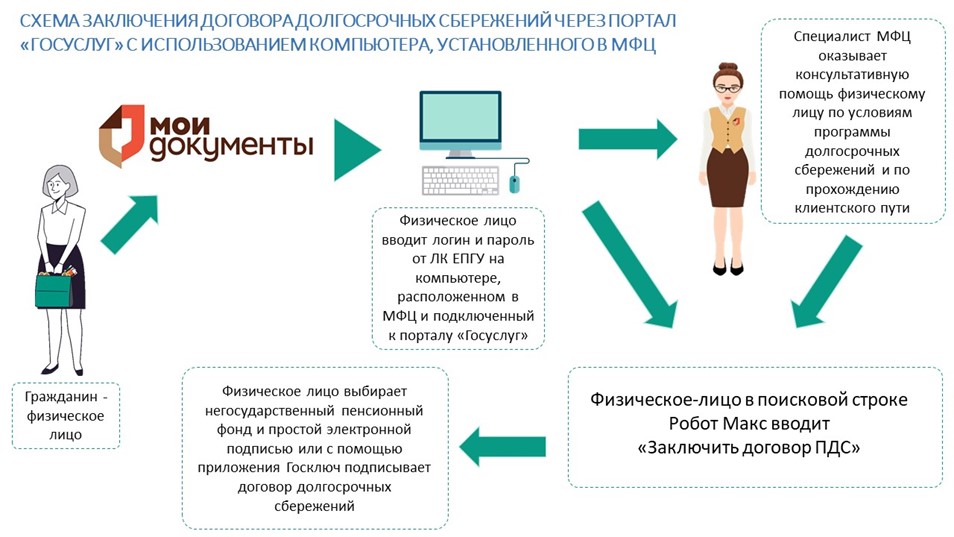 Для этого заявителю нужно авторизоваться на портале с использованием логина и пароля от своей учётной записи на Госуслугах. Далее в поисковой строке Робота Макса ввести «Заключить договор ПДС». Затем выбрать негосударственный пенсионный фонд и с помощью электронной подписи или приложения «Госключ» подписать договор. При необходимости консультационную помощь при заключении договора долгосрочных сбережений в электронном виде окажут работники МФЦ.