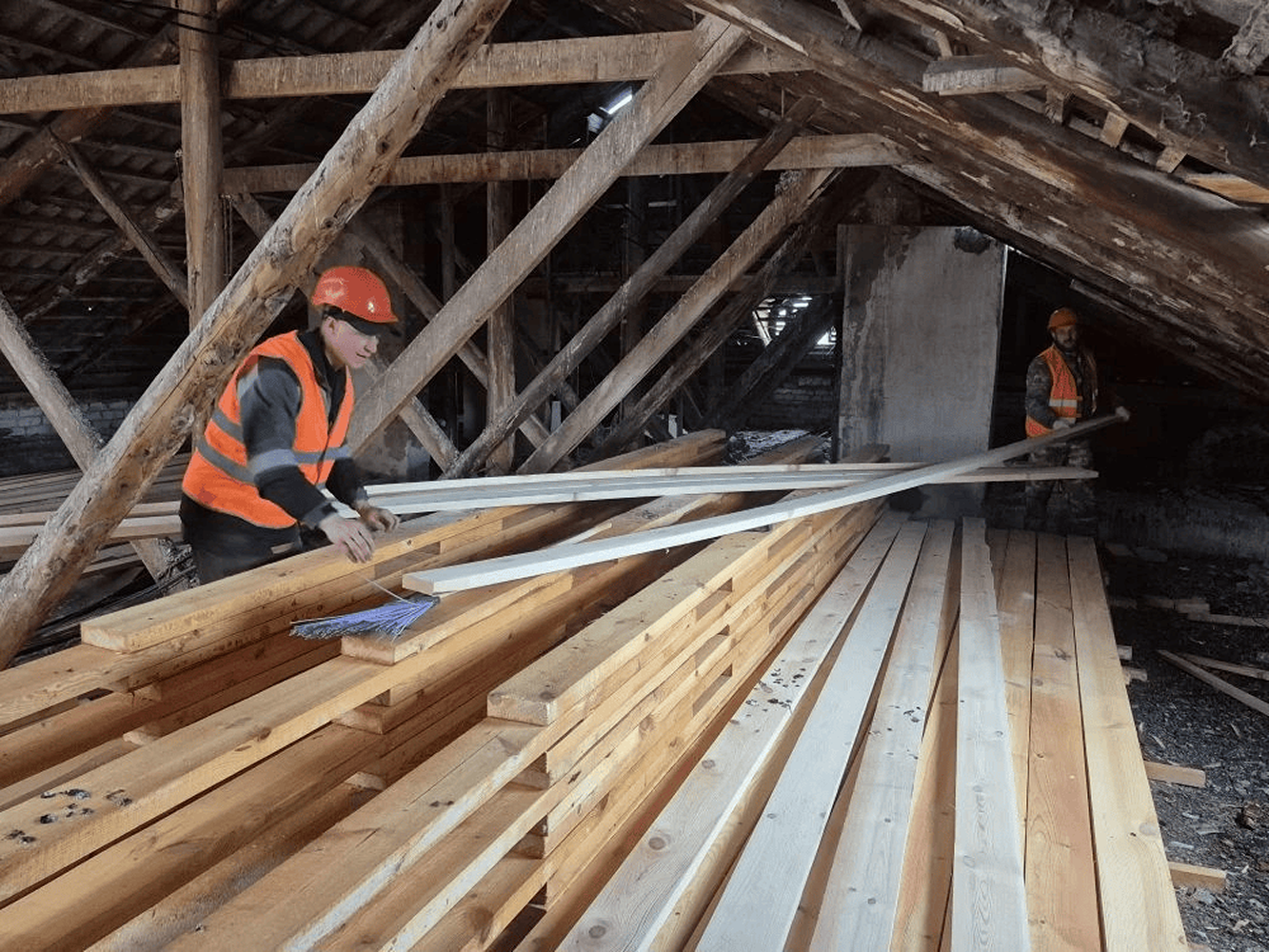 В середине апреля подрядчики приступили к выполнению работ на объекте. Строители разбирают существующую кровлю и несущие конструкции, после чего выполнят монтаж нового деревянного каркаса с устройством обрешётки и ветровлагозащитной плёнки, поверх которой уложат новую кровлю из металлического профлиста. Также будут обновлены дымовентиляционные каналы, утеплены чердачные перекрытия, проведена подшивка карнизов, установка системы ограждений и снегозадержания по периметру кровли, а также водосточной системы.