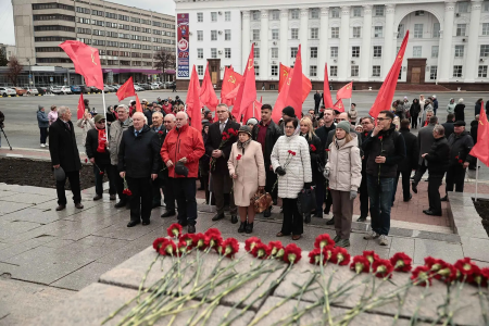 Участники церемонии возложили цветы к подножию памятника Владимиру Ильичу на Соборной площади. Знаковый монумент был открыт 22 апреля 1940 года, автором является выдающийся советский скульптор Матвей Манизер.
